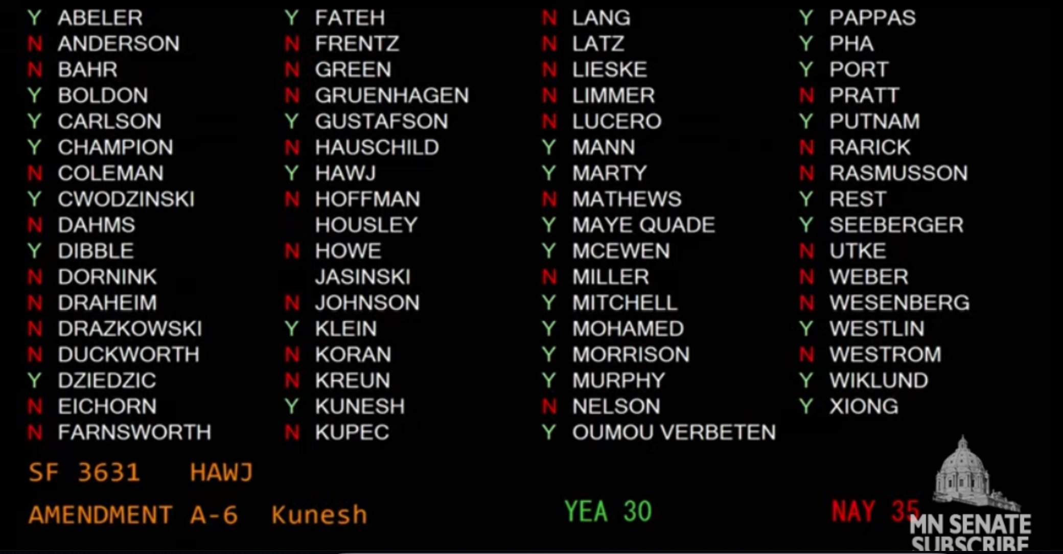 - Members of the 2023-2024 MN Senate voted on an amendment to the Senate Omnibus Environment Policy Bill, Senate File 3631 (Hawj), offered by Senator Mary Kunesh (D-New Brighton) on April 11, 2024 that would have banned a wolf hunting and trapping season in Minnesota. After a lengthy debate, the amendment failed to pass by a vote of 30-35. Click on this hyperlink to see the bipartisan vote in support for its adoption.