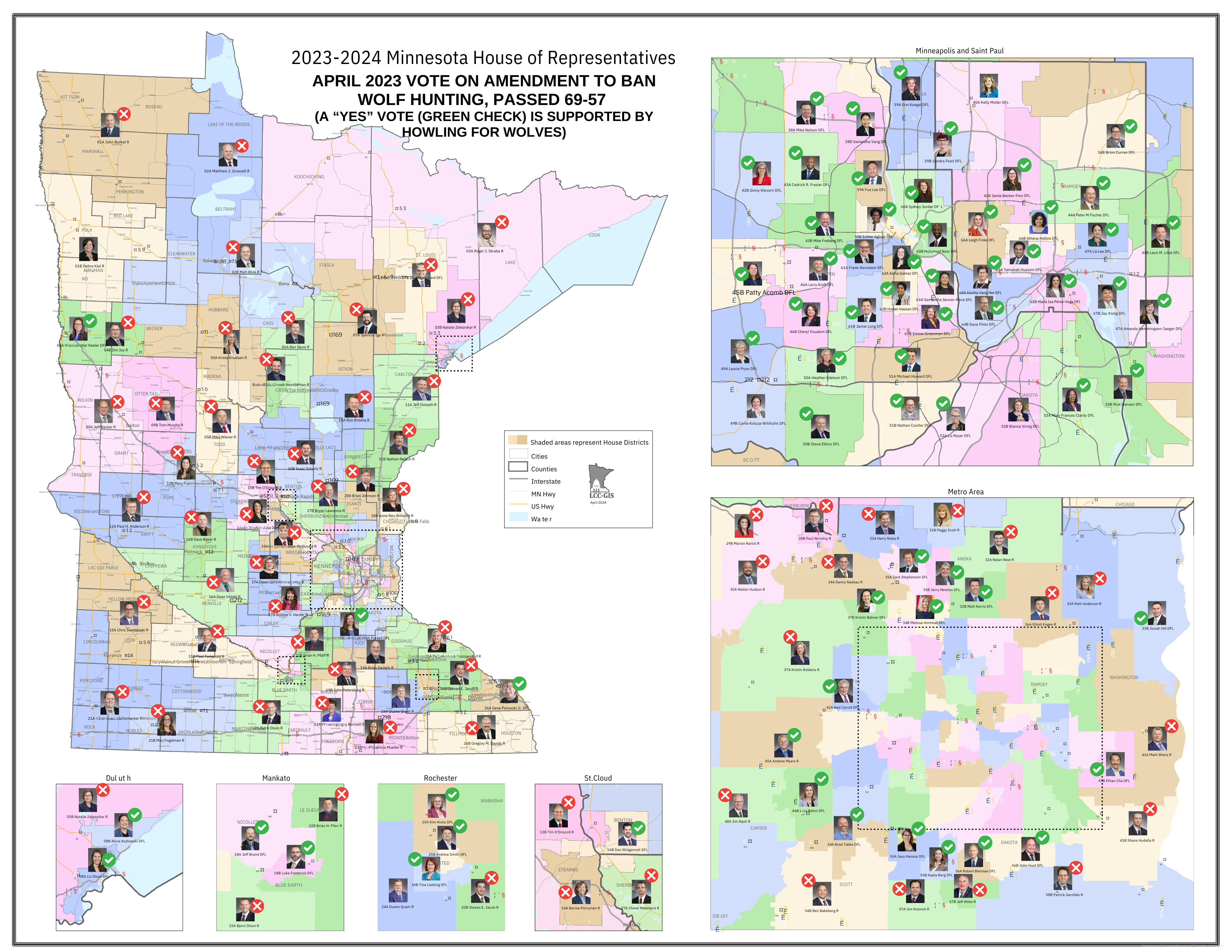 - Members of the 2023-2024 MN House of Representatives voted and passed an amendment to ban wolf hunting and trapping on April 17, 2023 - the top priority of Howling For Wolves. A "Yes" vote (to the left of the name) is supported by Howling For Wolves. The amendment was adopted by the full House but removed in the House/Senate Conference Committee.