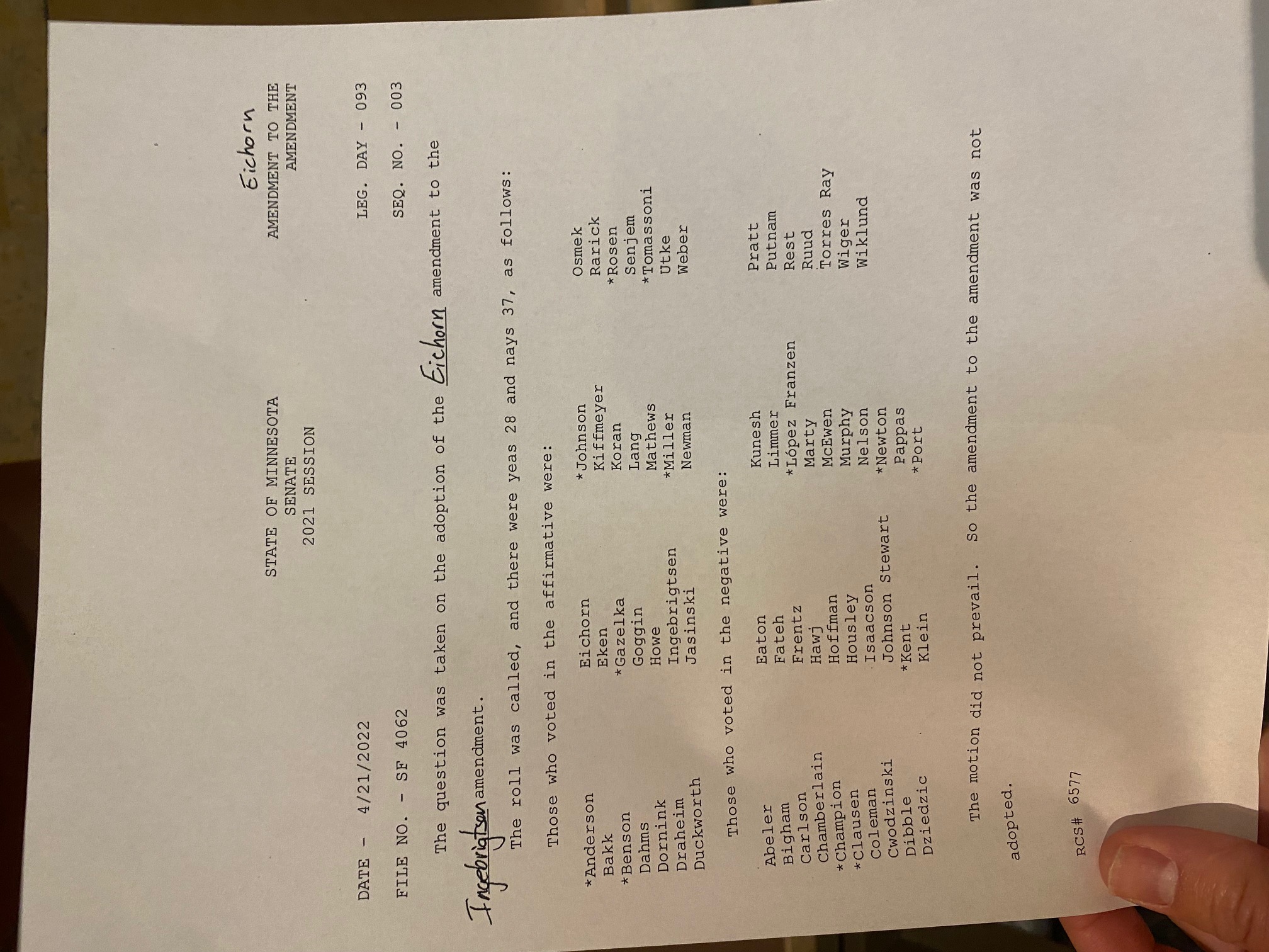 SENATE in 2022: Senate File 4062, Senator Ingebrigten’s omnibus environment finance bill (which included a mandatory wolf hunt), was taken up for passage off the Senate floor. The first amendment offered on the floor was Ingebrigtsen’s author’s amendment (numbered the A-54 amendment), which included the removal of the mandatory wolf hunt language along with several other revisions to SF4062. Senator Eichorn then offered the A-57 amendment to the A-54 amendment to delete the removal of the mandatory hunt from Ingebrigtsen’s amendment so that the language would stay in SF4062. After a 40-minute debate, the pro-wolf side prevailed on a bi-partisan vote of 37-28.