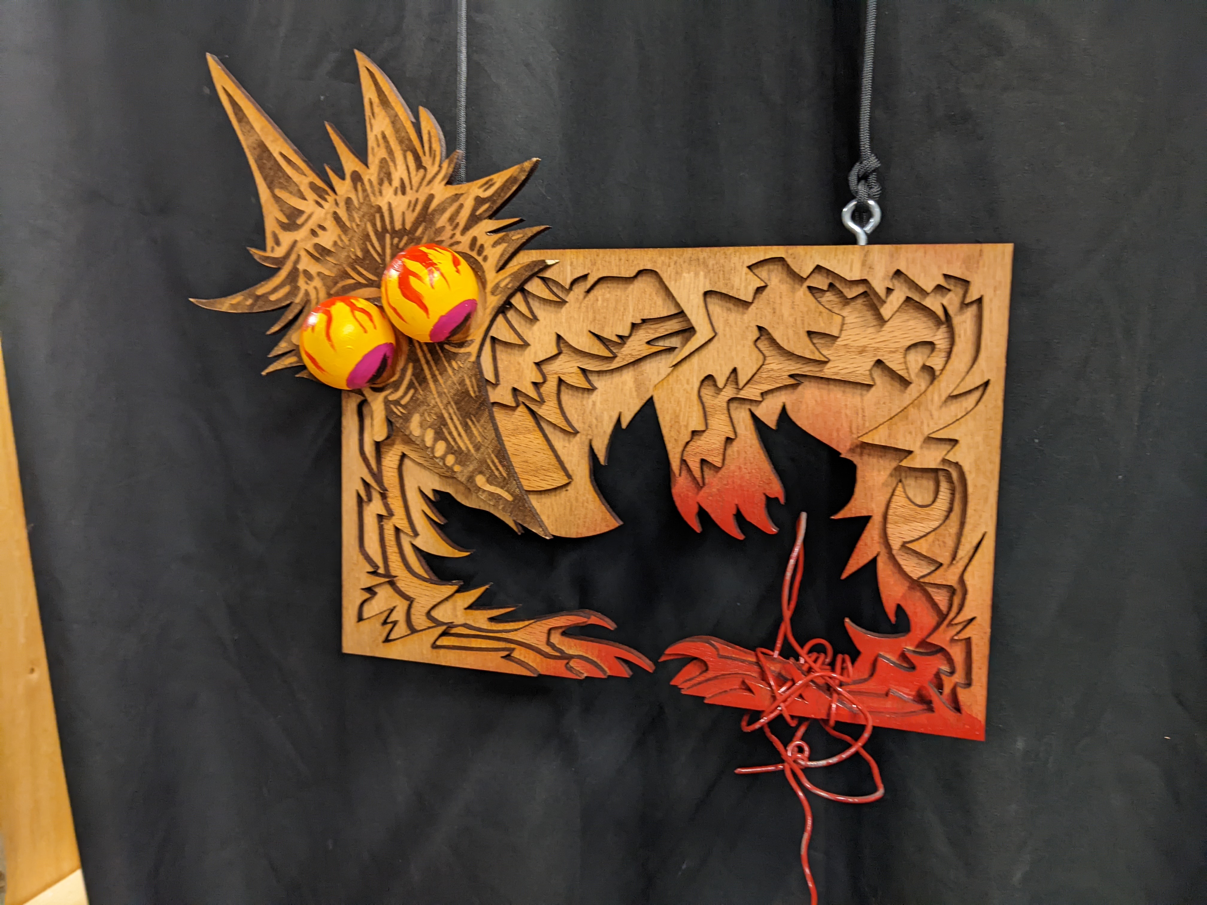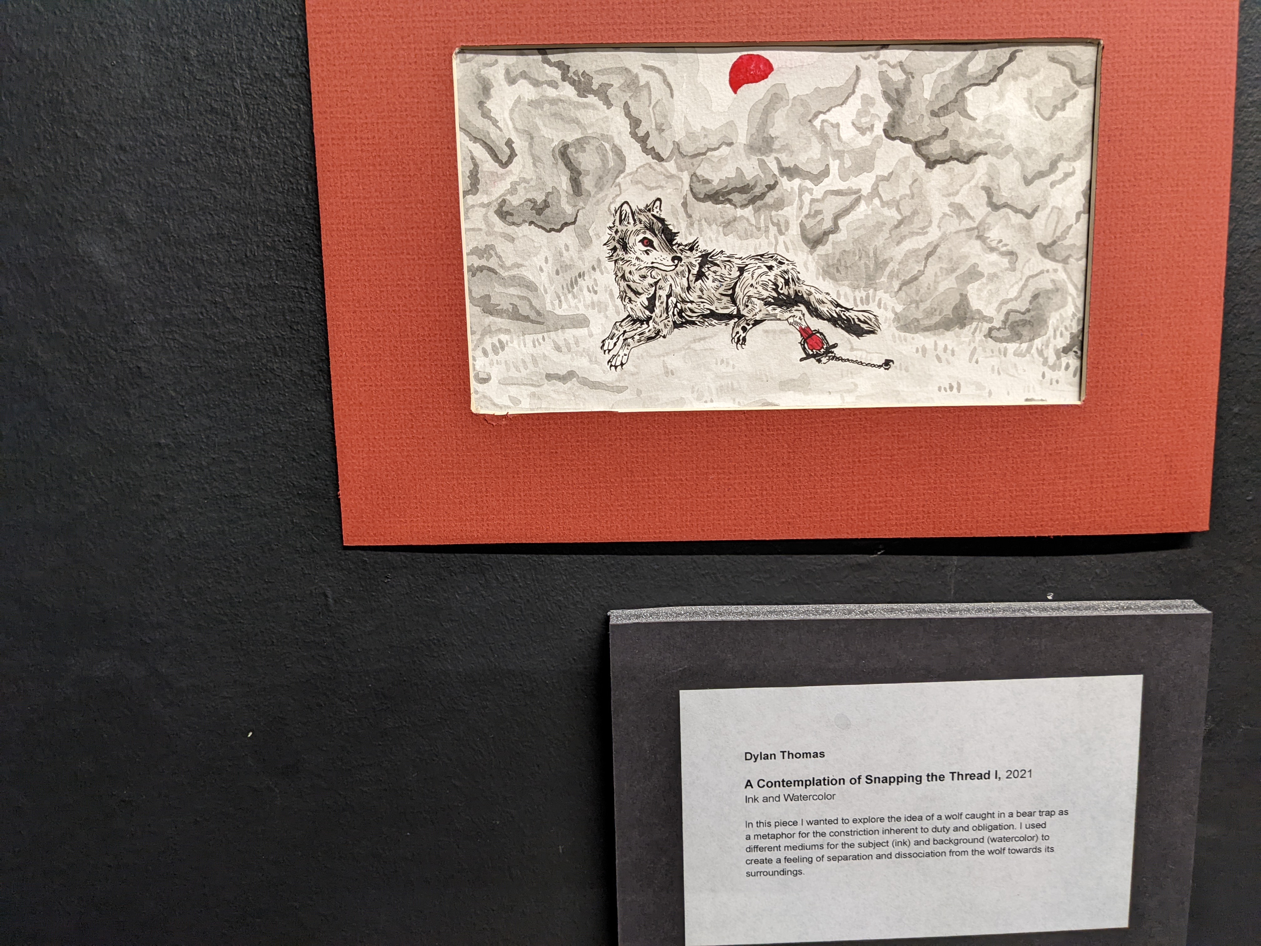 We are proud to feature these two creative art pieces by Dylan Thomas. Both pieces depict wolves caught in leg-hold traps, and the wood-cut piece has eyes made out of ping-pong balls. Dylan attends Great River School in St. Paul.