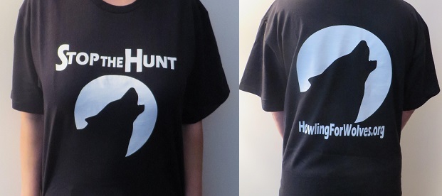 Please donate $20 to Howling For Wolves Action Fund and wear our Stop the Hunt T-Shirt with wolf logos on the front and back. The T-Shirts are made of 100% organic cotton. See sizing information.